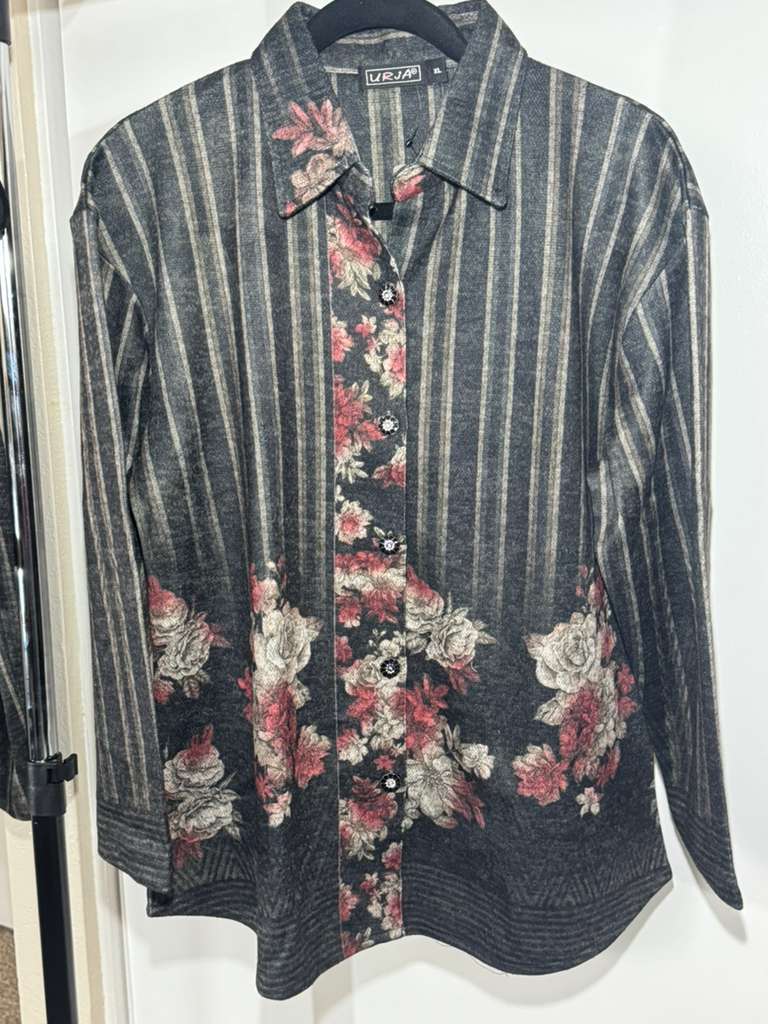 * Elegant vertical stripe pattern with floral print detailing