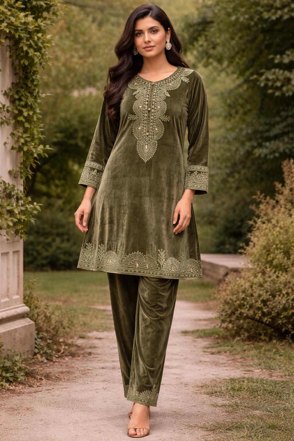 Soft velvet fabric • Elegant olive shade • Heavy embroidered neckline • Straight-fit kurti • Matching velvet pants • Festive & winter wear